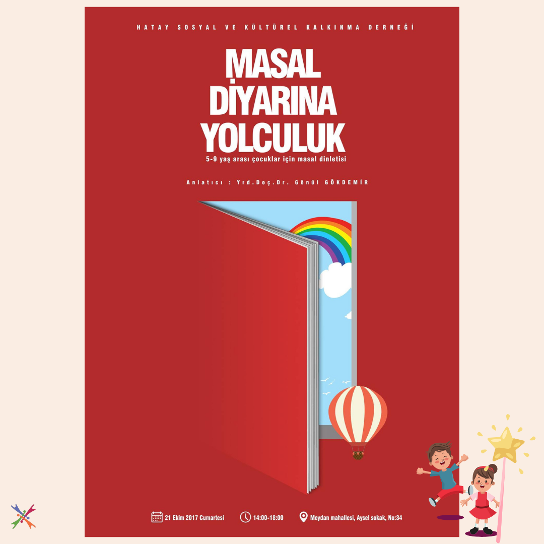 Derneğimiz 21 Ekim 2017 tarihinde Suriye’den göçle gelen çocuklara yönelik "Masal Anlatma Etkinliği" düzenlemiştir. Etkinlikte masal anlatımı Hatay Mustafa Kemal Üniversitesi Fen Edebiyat Fakültesi Türk Dili ve Edebiyatı Bölümü Öğretim Üyesi Gönül Reyhanoğlu ve yüksek lisans öğrencisi Leyla Arslantaş tarafından gerçekleştirilmiştir. Etkinlikle, çocukların dil gelişimine ve bilişsel gelişimlerine katkı sağlamak ve çocukların eğlenceli saatler geçirmeleri amaçlanmıştır.